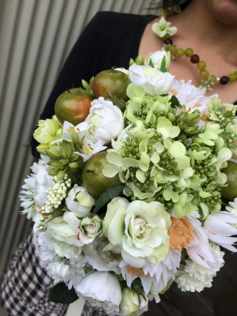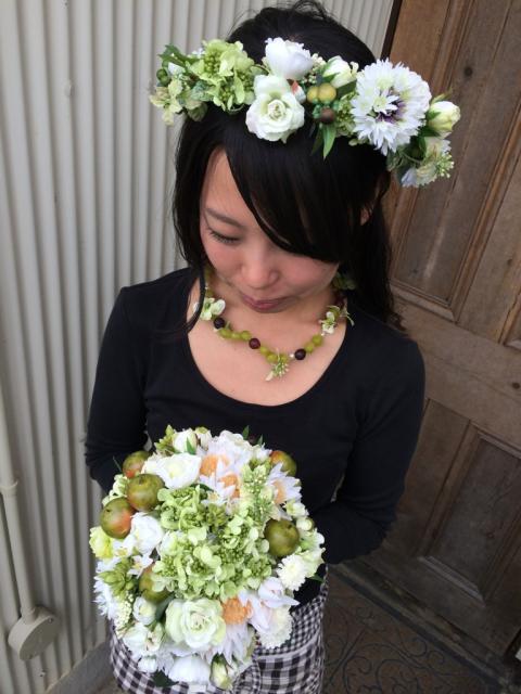 2014年09月17日(水) 秋、冬、春の結婚式ブーケ予約受付中 先月くらいからブーケ等のご依頼が増えてきました。 最近では、造花も進化してきてとても綺麗なものがたくさん出回っています。 それを使ってこんなに綺麗なブーケ、ブートニア、ネックレス、ヘアガーランドをお作りさせていただきました。 海外挙式にもオススメですし、ガーランドはリースとして壁に掛けて飾ったりもできるのでオススメです。 価格は生花と同じでお作りできます。 ☆お問い合わせはお電話で承っております。