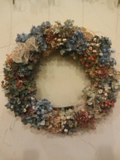 2009年11月08日(日) ドライフラワーのリース ドライフラワーのクリスマスリースのご注文があったので、アジサイをメインにして作りました。 もともとアジサイは大好きなのですが、完成したあまりの可愛さに♪♪♪♪♪心奪われました(>ν<) 次のお休みにさっそく自分で作ろうと思い、材料をお買い上げです☆ アジサイって生の時も素敵で、ドライになってもまたひと味違った良さがありますよね。 気が付けば我が家はアジサイのドライだらけになってます。。。f^_^;