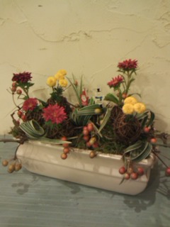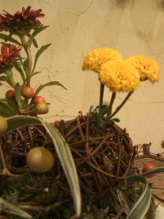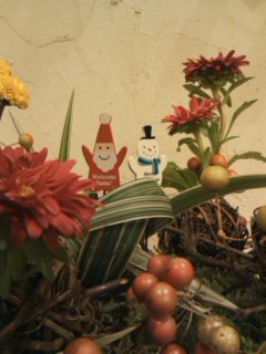 2009年11月10日(火) 小さな世界 画像のアレンジメントはプティフラワーと言って、小さな器にお花をいけた物です。 本当は手のひらサイズで作るのですが、今回は教室で作るので少し大きめです(^-^) サンタさんと雪だるま君が小さな世界の住人です☆