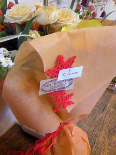 2009年12月01日(火) レクサス様とコラボです☆ レクサス様の今日ご注文の花束です☆ レクサス様は車を購入された方にお花をプレゼントされていて、そのお花をうちで作らせて頂いています。 この花束は、いつものラッピング+レクサスシールが付いています♪ レクサスシールはレクサス様のご注文だけですが、そこにいつもは葉や実をくっつけている店名シールをクリスマス仕様にし、フェルトを付けています☆ しばらくはこの雪の結晶のフェルトが花束やアレンジにつきます♪ ぜひぜひご注文してみて下さい☆