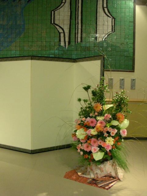 同じくバラ、ダリアなど洋花、ピンク系で明るく伸び伸びと生けました。