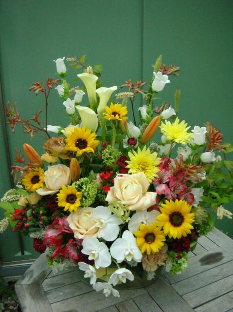 グリーンっぽいブリキの器に、ひまわりを入れてお作りしました。