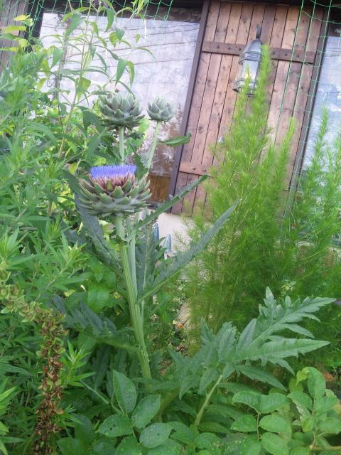 2011年07月13日(水) アーティチョーク 小さな株から植えたのに、今年は三つも花が咲きました)^o^V 一輪の花が手の平くらいに大きく、かなりの存在感があります。 アザミの仲間で青い不思議な綺麗な色で見ていても癒されます☆ イタリアやフランス料理では定番らしく、食べ方をネット検索!してみると… 花が咲く前のつぼみを食すようでした(:_;) また来年の楽しみかな(^_^;)