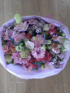 2007年10月25日(木) ☆素敵な花束☆ ダリア・カーネーション・トルコ・フウセントウワタ・ワックスフラワー・コスモス・・・ 優しいピンクのダリアと綺麗な黄緑色のフウセントウワタが、花束全体を可愛らしい雰囲気にしてくれています☆ 写真ではなかなか伝えきれないのが残念です(:_;)実物はもっともっと素敵なんですよ(>_<) Kame